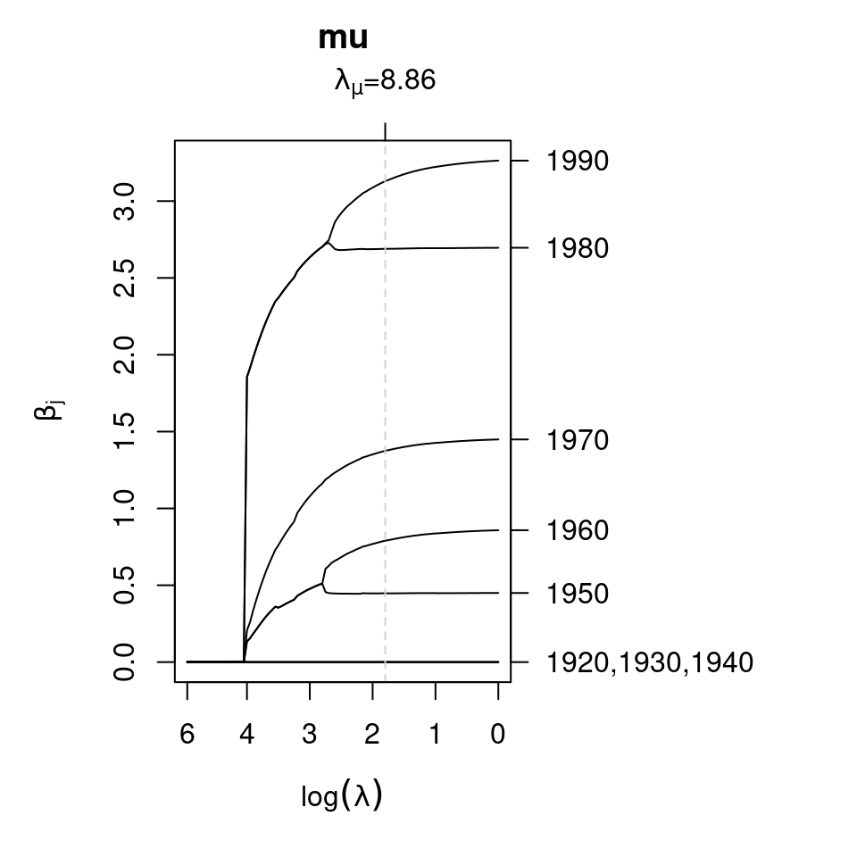 In this example both tuning parameters have the same value, also indicated by the gray dashed vertical lines. The coefficient paths w.r.t. the tuning parameters can be plotted, e.g., for parameter \(\mu\), with